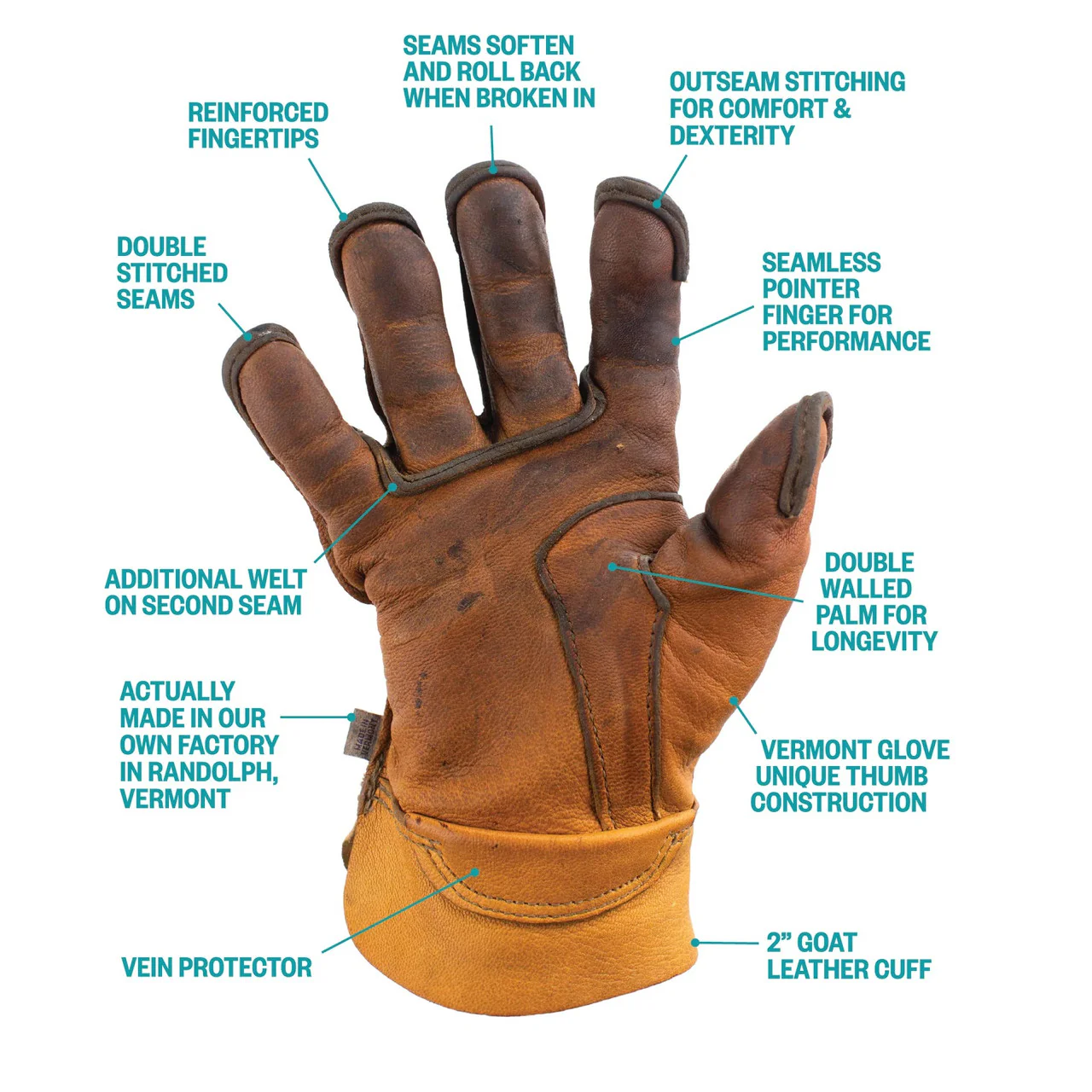 Crafted by hand in Vermont from 100% goatskin leather, this flagship work glove is built for serious durability, unmatched dexterity, and long-term comfort. The leather starts out soft and breaks in like your favorite baseball glove, developing a unique patina with every job and every season.